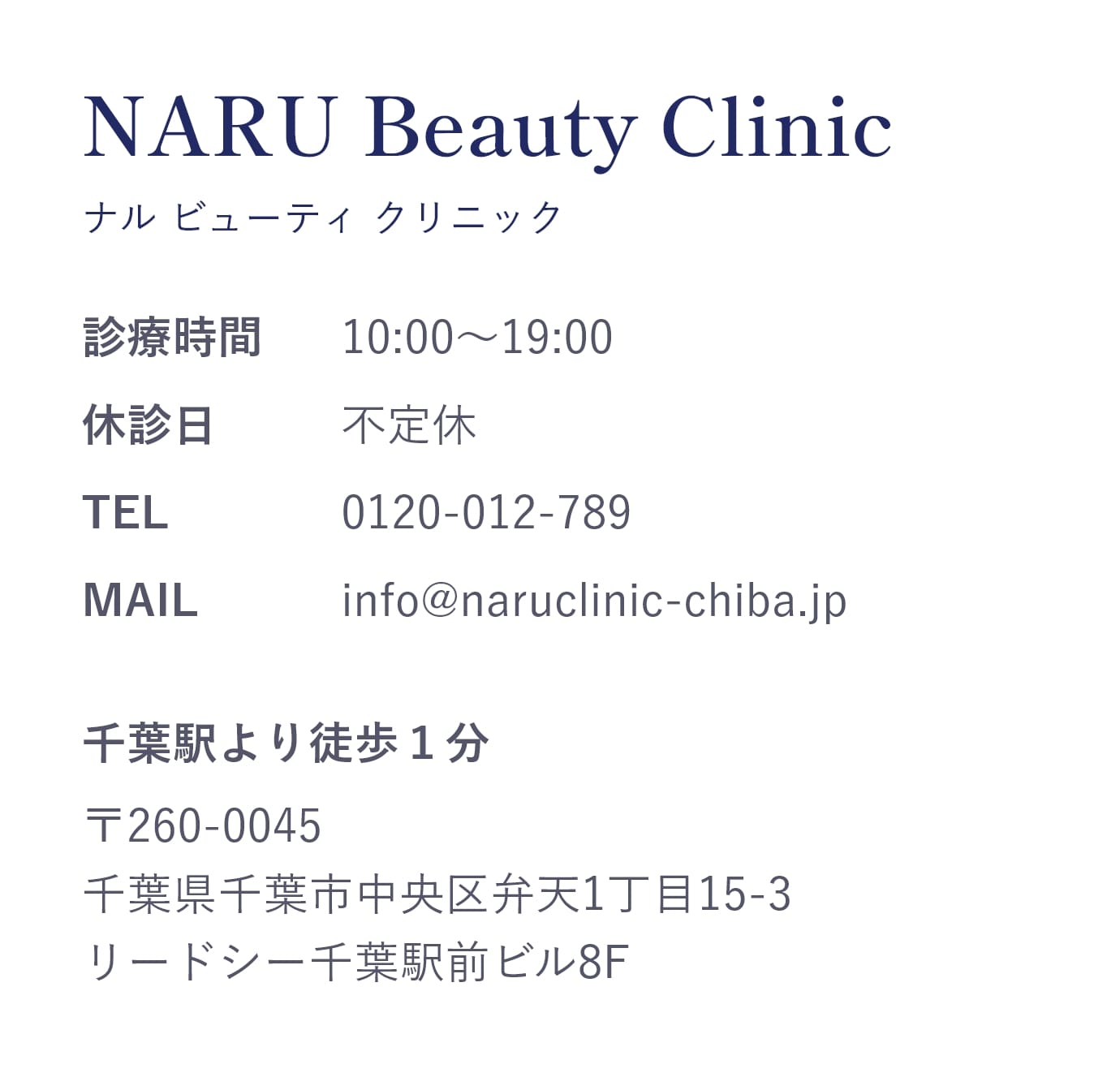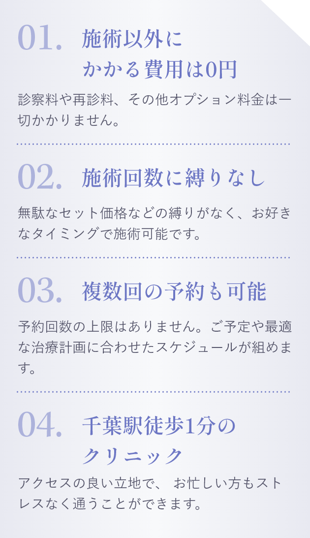 私は大手美容クリニック千葉院の院長として数多くの患者様を診察してきました。その後、「美容医療の素晴らしさを知るきっかけとなるクリニック」を作りたいと思い地元の千葉で開業しました。そのため当院ではダウンタイムやリスクの少ない施術をメインに行っています。私を含め当院のスタッフも数分の施術で自分が変わる美容医療の素晴らしさを体験した1人です。「美容医療に興味はあるけど怖い」、「ダウンタイムがとれない」という方は是非私たちにご相談ください。