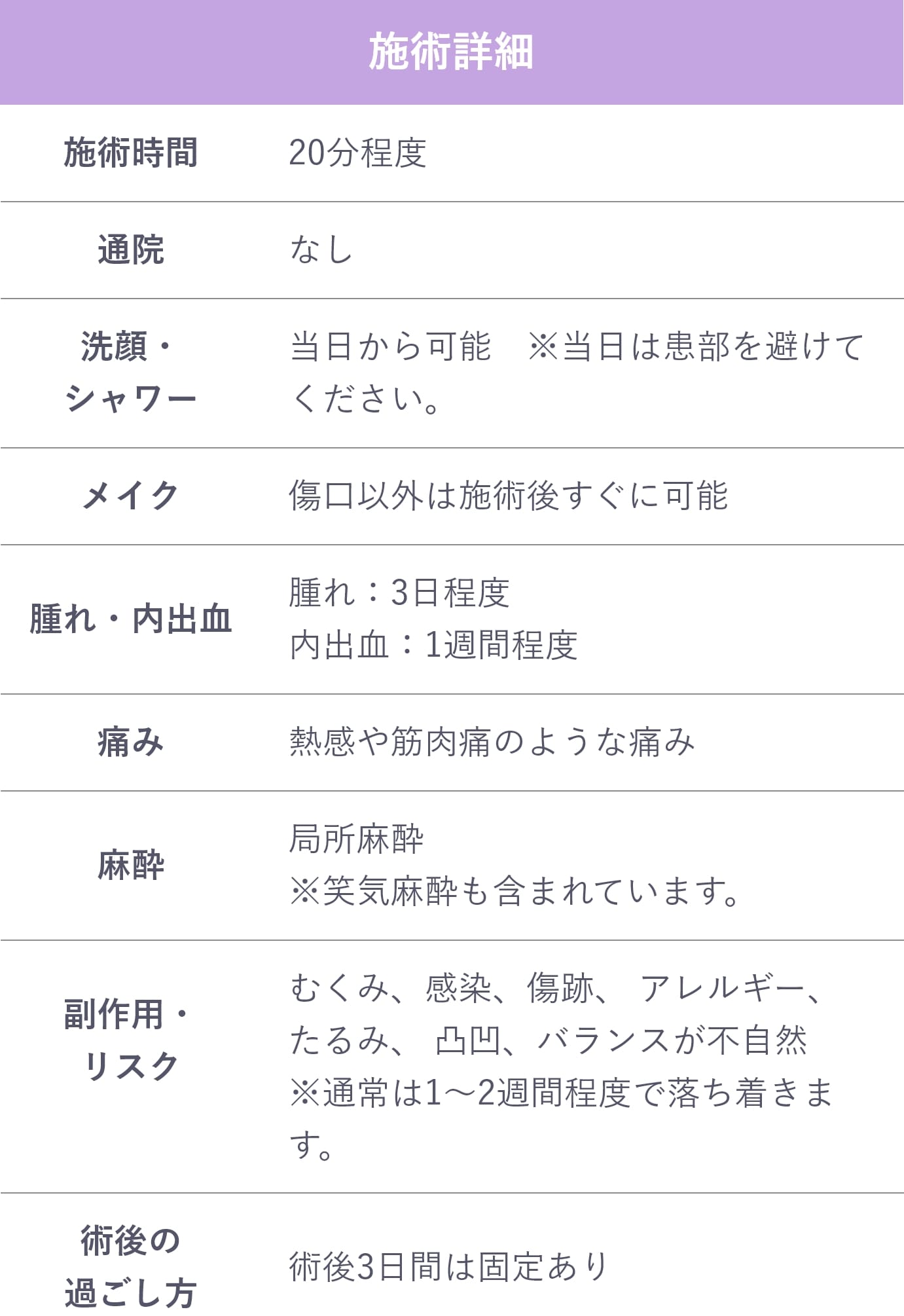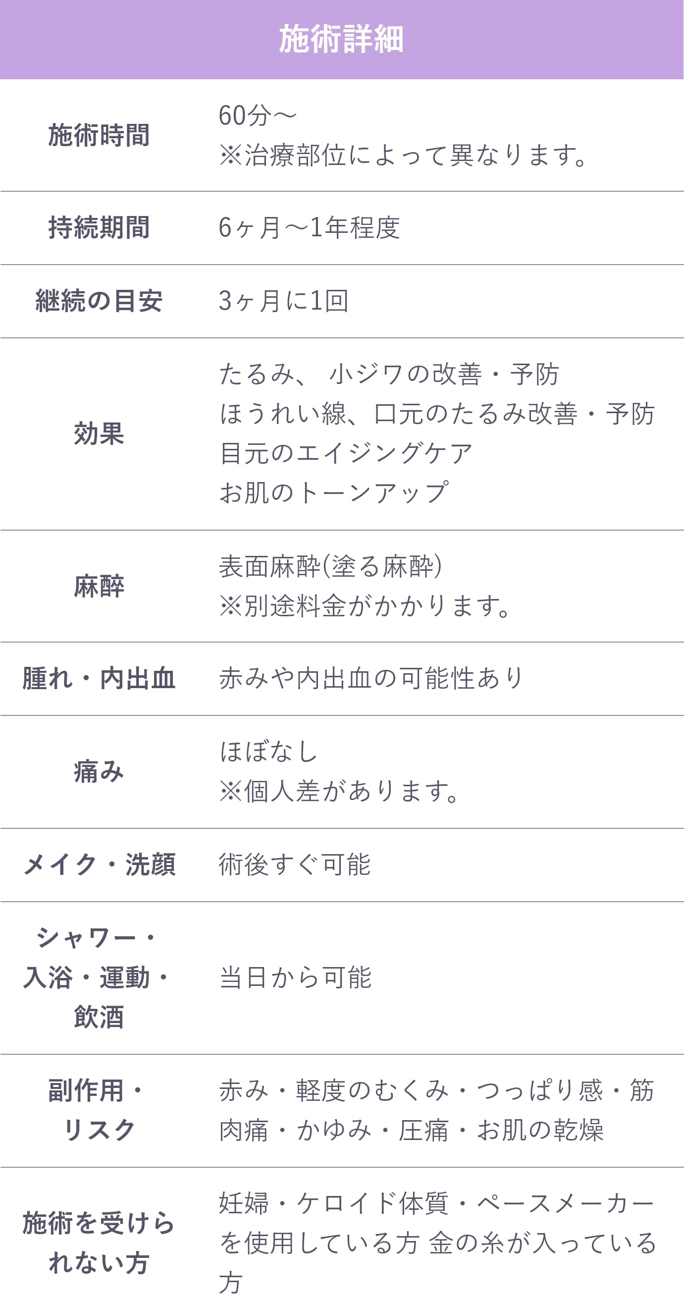 ハイフは、肌の土台である筋膜層を熱エネルギーで引き締める施術方法です。フェイスラインの引き締めとあわせて、頬全体がひきつるような違和感を感じる場合がございます。施術後、数時間〜数日間でおさまります。