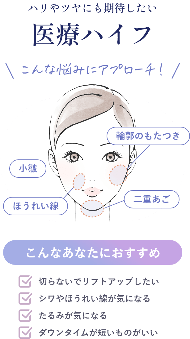 医療ハイフは、熱ダメージを受けた皮膚組織が修復するとき、コラーゲンが生成されて、肌を引き締めます。 また、皮膚表面へのダメージもほとんどないため、気軽にできるエイジングケアとして人気の施術になっています。