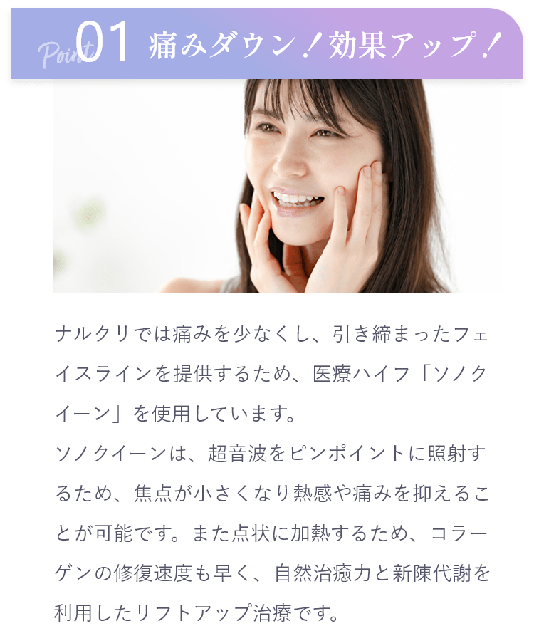 当院のハイフの機器は痛みを感じにくい仕様になっております。しかしながら痛みの感じ方には個人差があり、ハイフの熱エネルギーが骨に響くようなピリピリとした痛みを感じる場合があります。施術者が患者様とコミュニケーションをはかり、痛みの程度を確認しながらゆっくりと施術を進めてまいります。