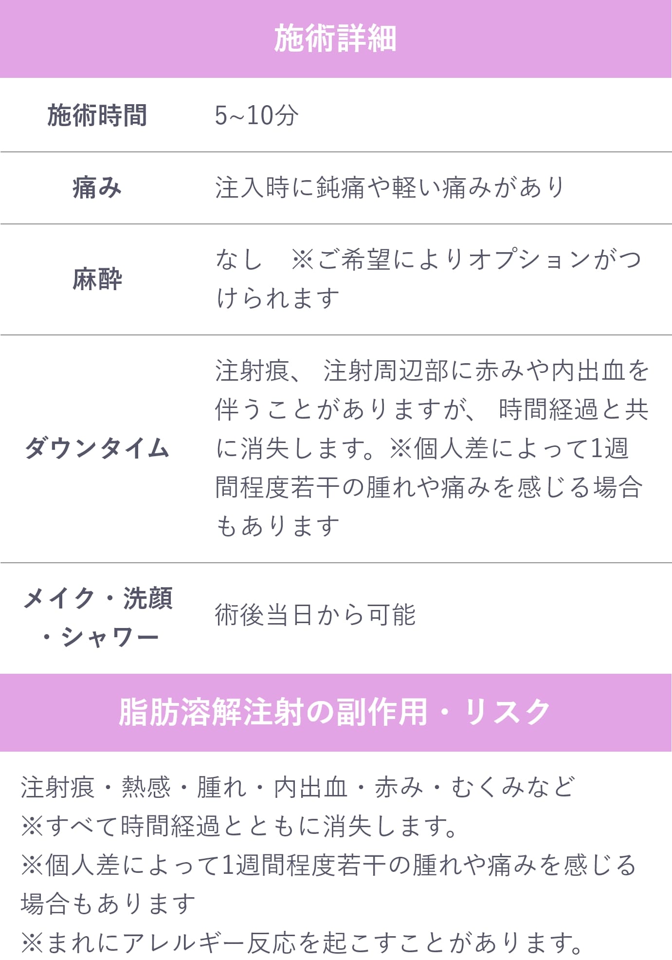 脂肪溶解注射は、リンパの循環作用を高める成分が配合されているため、除去された脂肪や体内の老廃物の排出を促進し、3日程度で効果を実感できます。