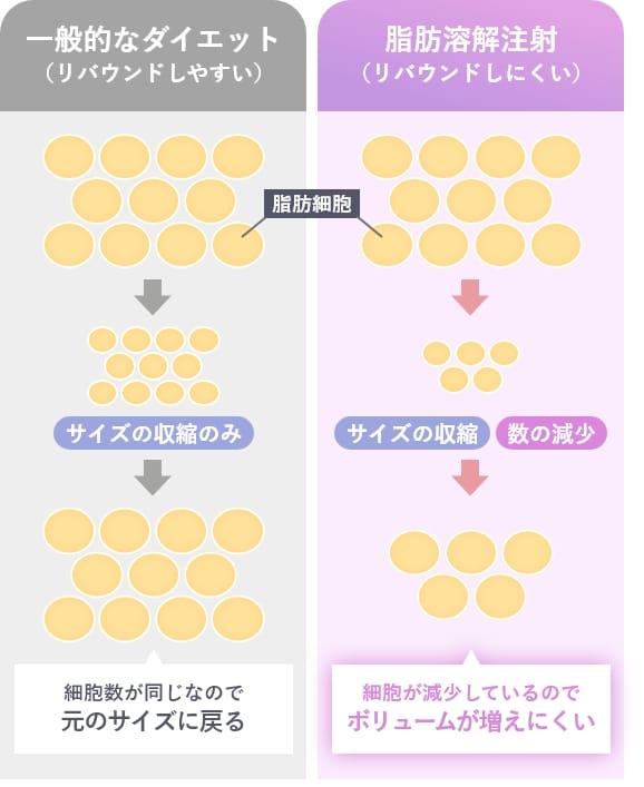 顔のお肉は食事制限や運動では落ちくいと言われますが、注射により脂肪細胞そのものに働きかけるため、治療後はリバウンドが起きにくいというメリットがあります。