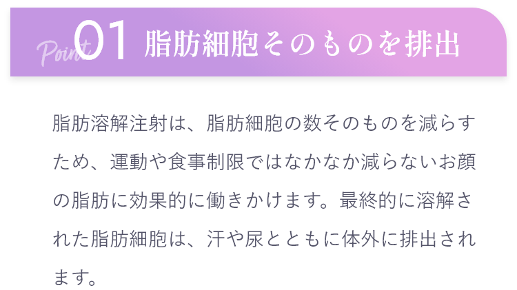脂肪細胞そのものを分解し、尿などとともに体外へ排出することで脂肪細胞を減少させ、小顔・顔やせを促進します。
