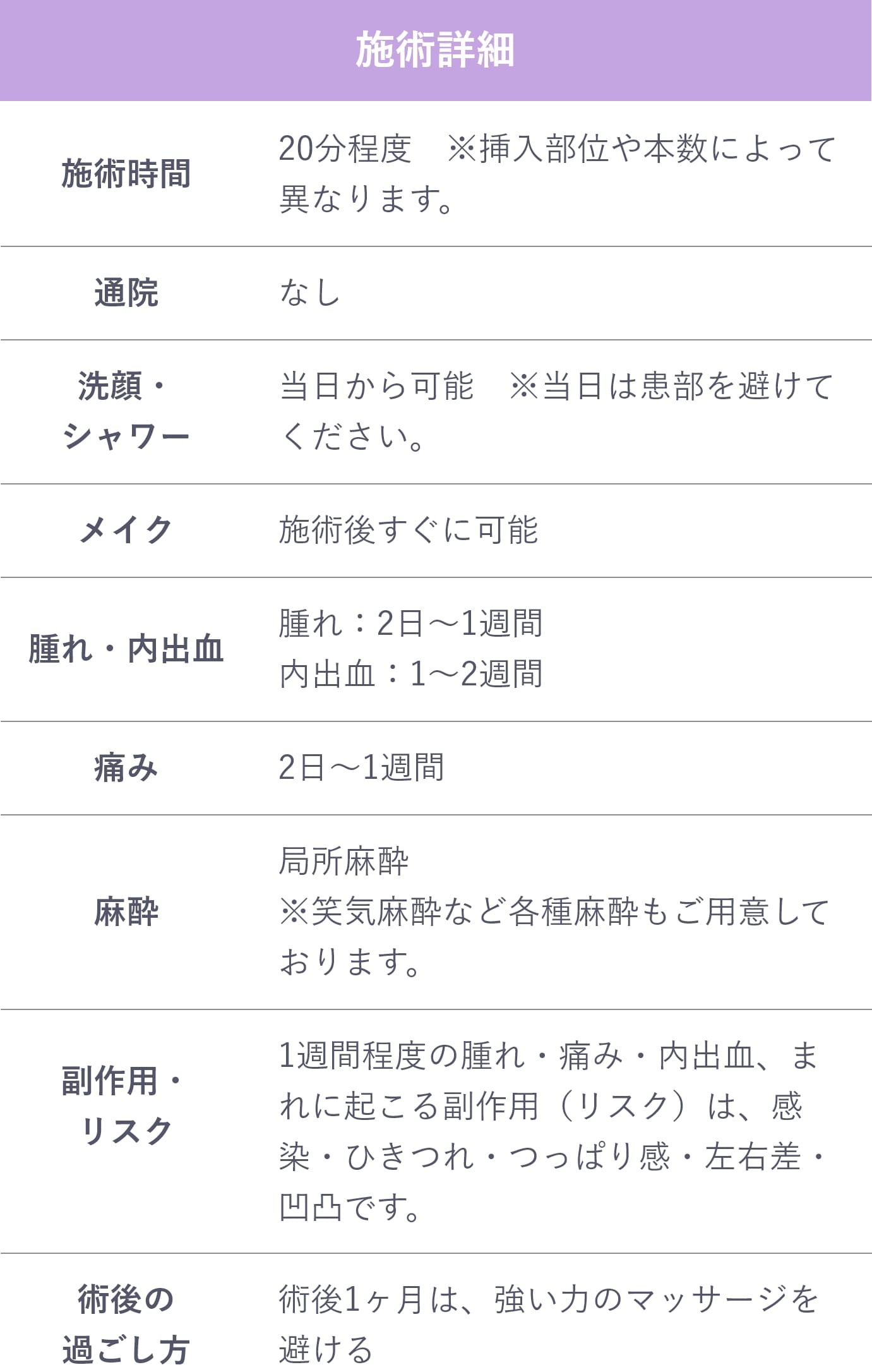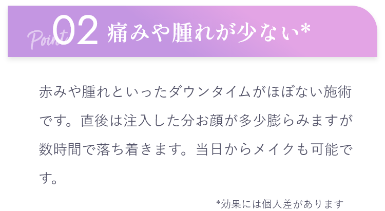 直後は注入した箇所が少し腫れますが2.3日で落ち着きます。