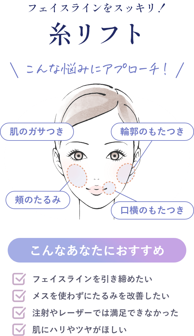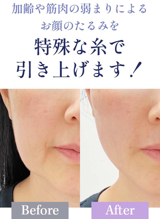糸リフトは、フェイスリフトのような大掛かりな手術をすることなく、時間が経つと体内に吸収される特殊な糸を皮膚の下に通して、たるみをリフトアップする治療です。