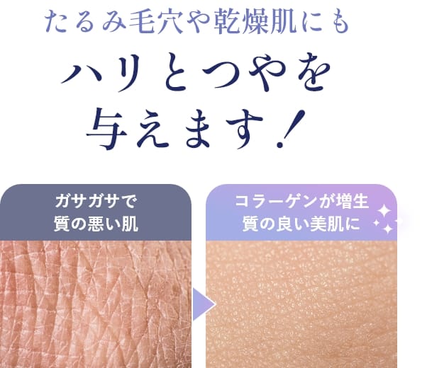 皮下組織でコラーゲンが増生すると肌が引き締まるため、「たるみ毛穴」や「乾燥肌」にもアプローチします。