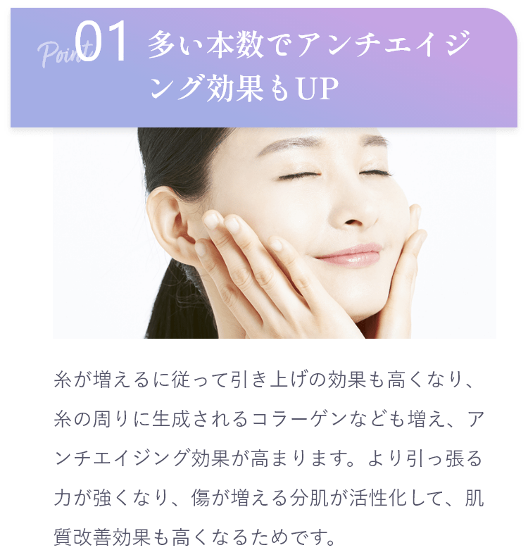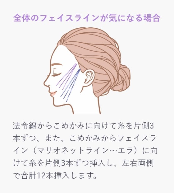 糸の本数には個人差がありますが、たるみをしっかり引き上げたい方は、片側3本(左右で合計6本)以上の糸を挿入するとフェイスラインがきれいに整います。