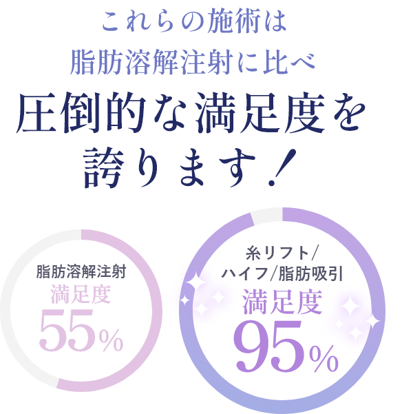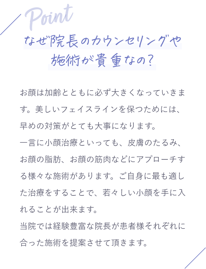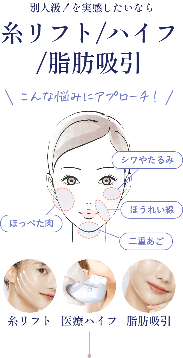 お悩みの部位や理想のフェイスラインによって施術の組み合わせが異なるので、詳しくはカウンセリングにてご相談ください。