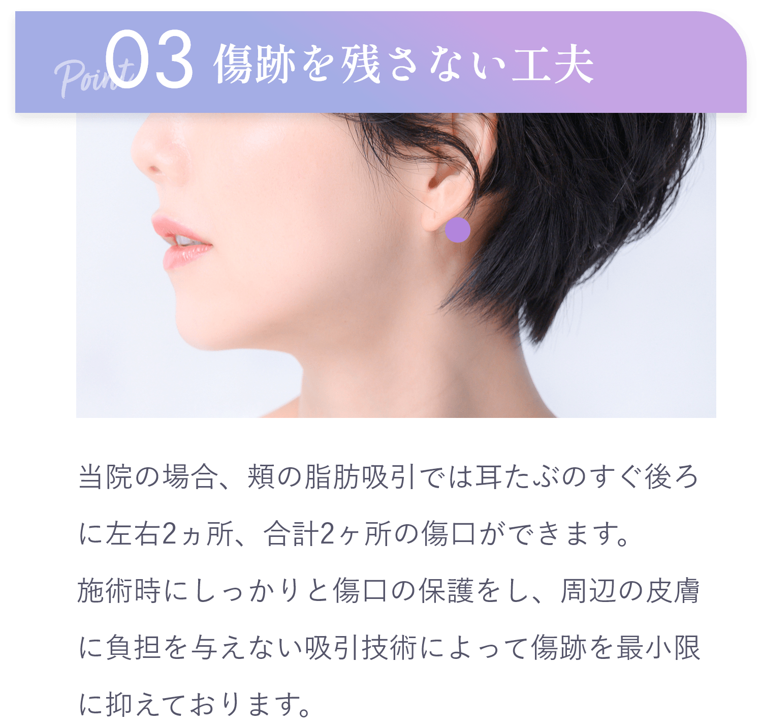 カニューレ(吸引管)を挿入する切開口は、耳下に2mmほどの長さで済みますので、ほぼ目立ちません。特に髪の毛の長い方は、傷口を隠すことができますので、傷が治るまで周りにバレることはほぼありません。