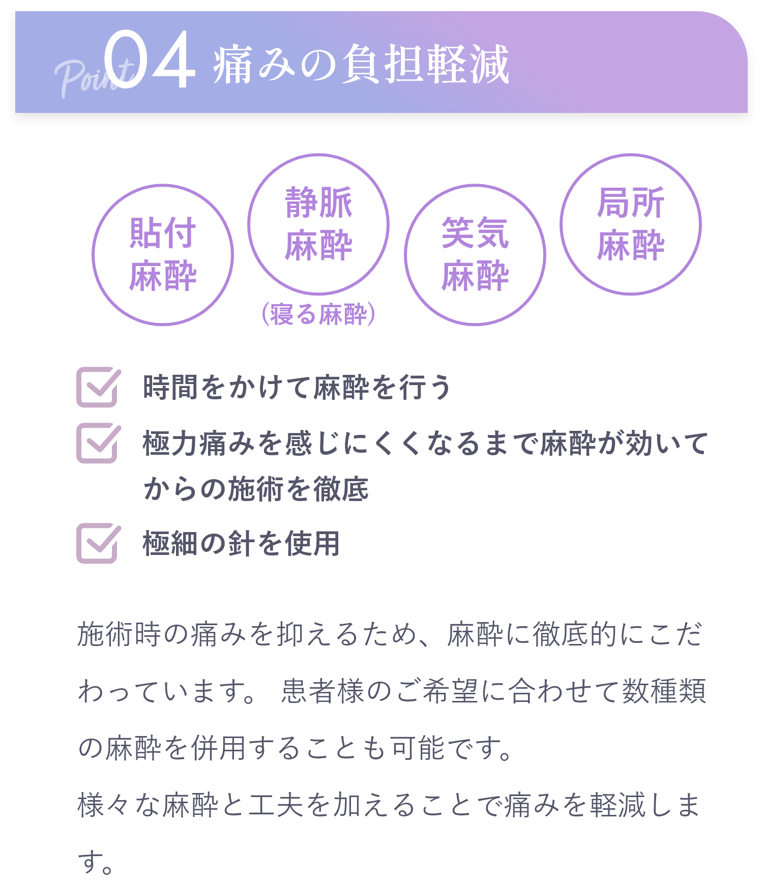 局所麻酔の場合は麻酔時に痛みがあります。痛みに弱い方はその他の各種麻酔もご用意しておりますのでご相談ください。