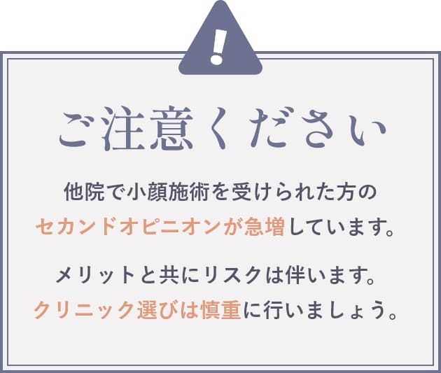 顔が大きい原因が脂肪タイプであれば、確実に今より小顔になることができます。ただし、筋肉が原因で顔が大きくなっている場合は、他の整形方法の方が小顔になれる場合があります。ご自身がどちらのタイプで顔が大きいのかお悩みでしたら、無料カウンセリングにてご相談ください。経験豊富なドクターが、患者様にとって最適な小顔整形をご提供いたします。
